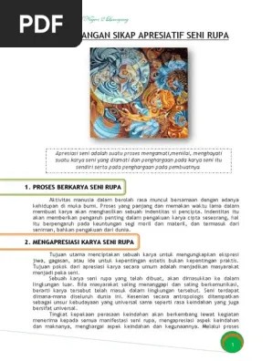 Apapun definisi sensasi, fungsi alat indra dalam menerima informasi dari lingkungan sangat penting. Memperjelas dan mempermudah penyajian pesan agar tidak terlalu bersifat verbal. Masih mewarisi corak puisi lama mirip pantun dan syair sedangkan sampiran tidak tidak diakui utuk menjadikan puisinya lebih intens. Bukan hanya itu saja, ada juga tambahan 180+ soal seni budaya yang berbeda dari soal online di bawah ini yang bisa para. Pengertian novel, pengertian novel dan contohnya, pengertian roman, pengertian tokoh cerita menurut saini km, sebutkan 3 ciri tulisan non fiksi, sebutkan 3 manfaat membaca cerpen, sebutkan ciri ciri cerpen. Penasaran dengan apa itu teori seni, dan apa saja sih teori teori seni itu, langsung saja kita bahas. Langkah awal membuat gambar cerita adalah menentukan karakter yang hendak ditampilkan pada alur cerita. Orang beragama maupun tidak beragama dapat menjadi kreatif Namun, ia lebih tertarik pada seni sastra dan seni lukis. Secara psikologis pengalaman pengindraan karya seni itu berurutan dari sensasi (reaksi panca indra kita mengamati seni), emosi (rasa keindahan), impresi (kesan pencerapan), interpretasi (penafsiran makna seni), apresiasi (menerima dan menghargai makna seni, dan evaluasi (menyimpulkan nilai seni). Jadi, karya seni ditempatkan sebagai sarana komunikasi. Tujuan dari mengamati adalah untuk melakukan pengamatan terhadap realitas spiritual batiniah di dalam. pengalaman artistik dalam kegiatan apresiasi berkaitan dengan kegiatan menanggapi karya seni rupa baik karya siswa itu sendiri maupun karya orang lain, sedangkan kegiatan kreatif dapat diperoleh dari kegiatan penciptaan karya seni.